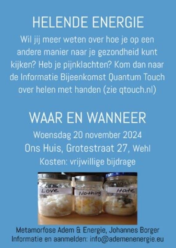 Wil jij meer weten over hoe je op een andere manier naar je gezondheid kunt kijken? Of heb je pijnklachten? Kom dan naar de Informatie Bijeenkomst Quantum Touch over helen met handen (zie qtouch.nl).