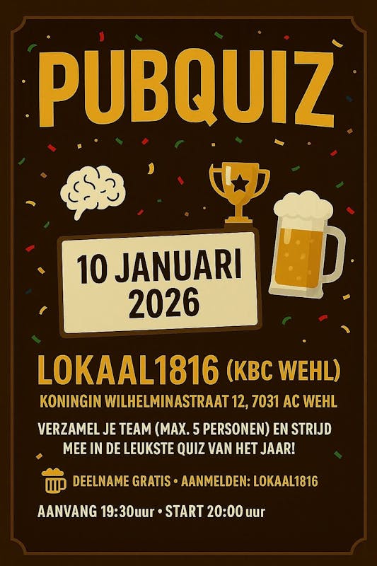 Deur open om 19.30 uur, aanvang quiz om 20.00 uur.