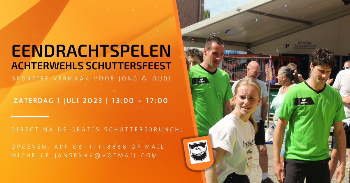 Ook zullen de Eendrachtspelen vanaf 13.00 uur weer plaatsvinden. Deze spelen - welke georganiseerd worden door een grote groep jonge vrijwilligers - zijn voor boogbuurten, vriendengroepen en iedereen die het leuk vindt om deel te nemen aan een sportieve middag. Aanmelden kan door een appje te sturen naar: 06-11118868 of te mailen naar . Welke groep gaat er dit jaar met de bokaal vandoor? De gehele middag zal er sfeermuziek klinken in- en om de feesttent en terras.
