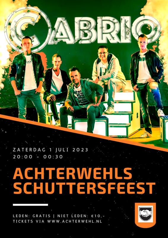 Het dak gaat er af met Cabrio! Het hoogtepunt van schuttersfeest is toch wel de zaterdagavond. We zijn blij dat we deze band weer hebben kunnen vastleggen en hopen samen met jou er een knalfeest van te mogen maken. Ook hierbij geldt: leden krijgen een ticket toegestuurd, en niet-leden zijn meer dan welkom als ze een ticket in de webshop bestellen voor maar €10,-. Nodig al je vrienden, familie en buren uit, want schuttersfeest vieren we samen!