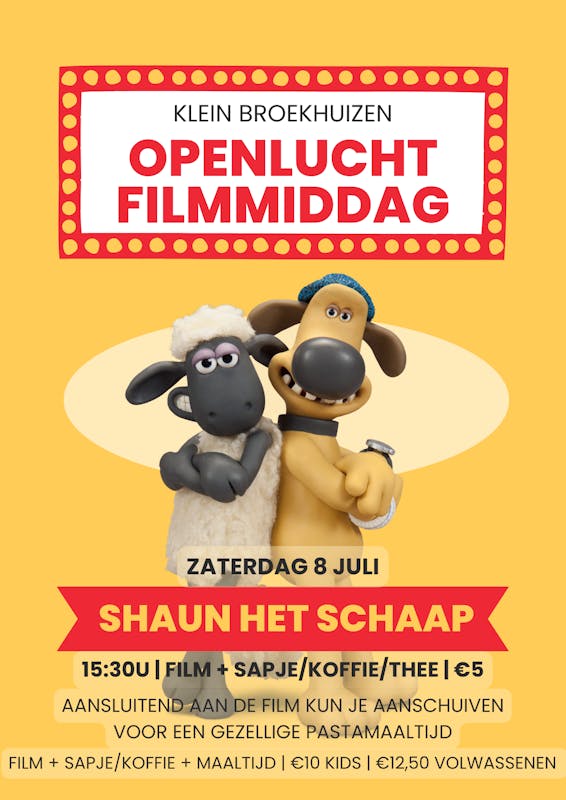 Zaterdagmiddag 8 juli organiseren we een filmmiddag die leuk is voor alle leeftijden. Dus kom met je kinderen of kleinkinderen! We kijken naar Shaun het schaap-de film, waarin Shaun en zijn vrienden naar de grote stad gaan om hun boer weer veilig terug naar de boerderij te brengen. Hier beleven ze natuurlijk allerlei avonturen. Een trailer van de film kun je bekijken door op deze link te klikken. Na de film is er de mogelijkheid om een lekker bord pasta mee te eten, geschikt voor alleseters en kieskeurige eters;).