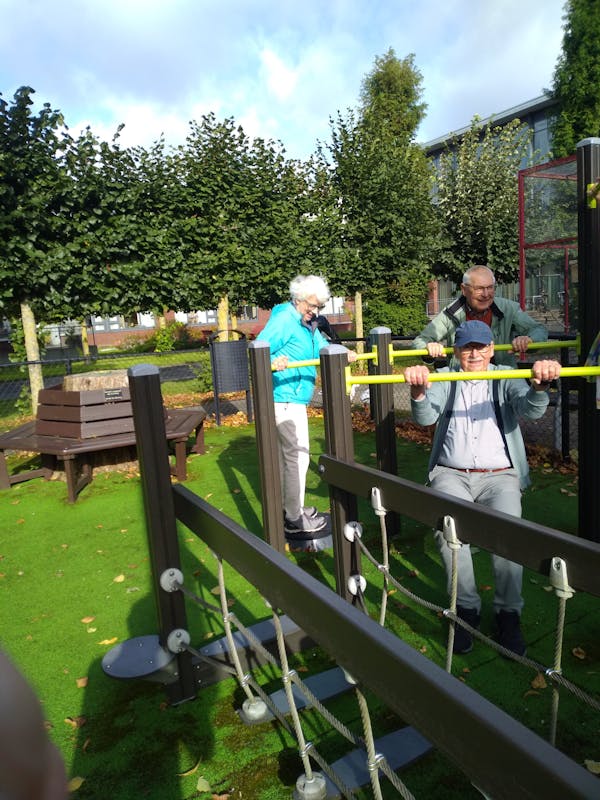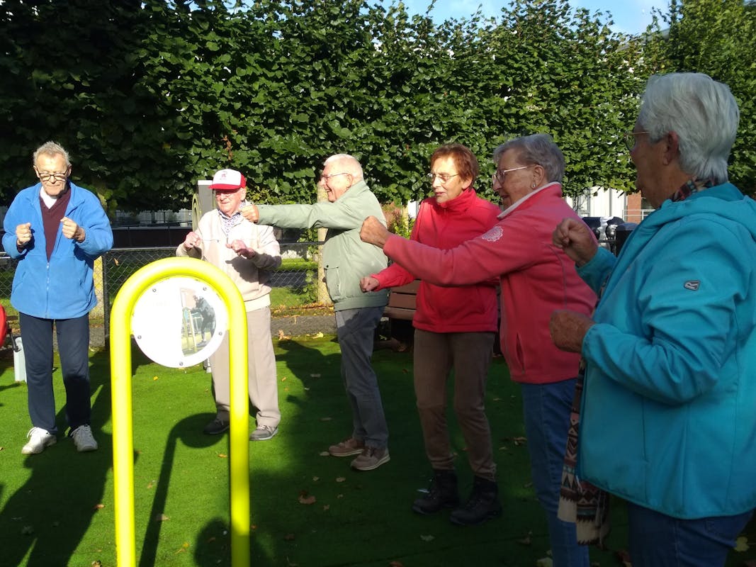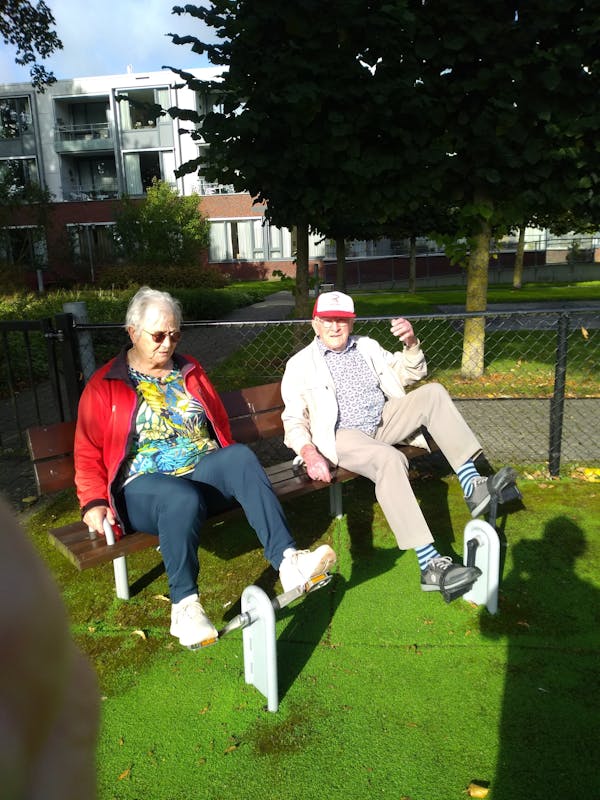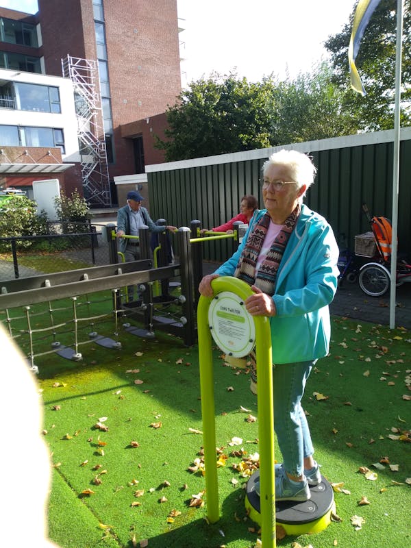 Daarna bewegen op fitnesstoestellen. De oefeningen zijn gericht op coördinatie, balans, lenigheid en uithoudingsvermogen. Eenieder zijn/haar tempo, onderwijl eventueel bijpraten op de prachtige VVO-bank. Dan volgt krachtoefeningen met gewichten en eindigen met coolingdown, rek en strekoefeningen. Er is aangepaste muziek. Er zijn geen kosten aan verbonden. Tot slot gezamenlijk koffie drinken.