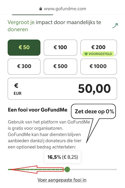 Via GoFundMe staat er standaard een extra fooi van 16,5%. Zet dit zelf op 0%, dan gaat je hele donatie naar de actie. Je hoeft je niet schuldig te voelen: elk platform rekent altijd wat transactiekosten.
