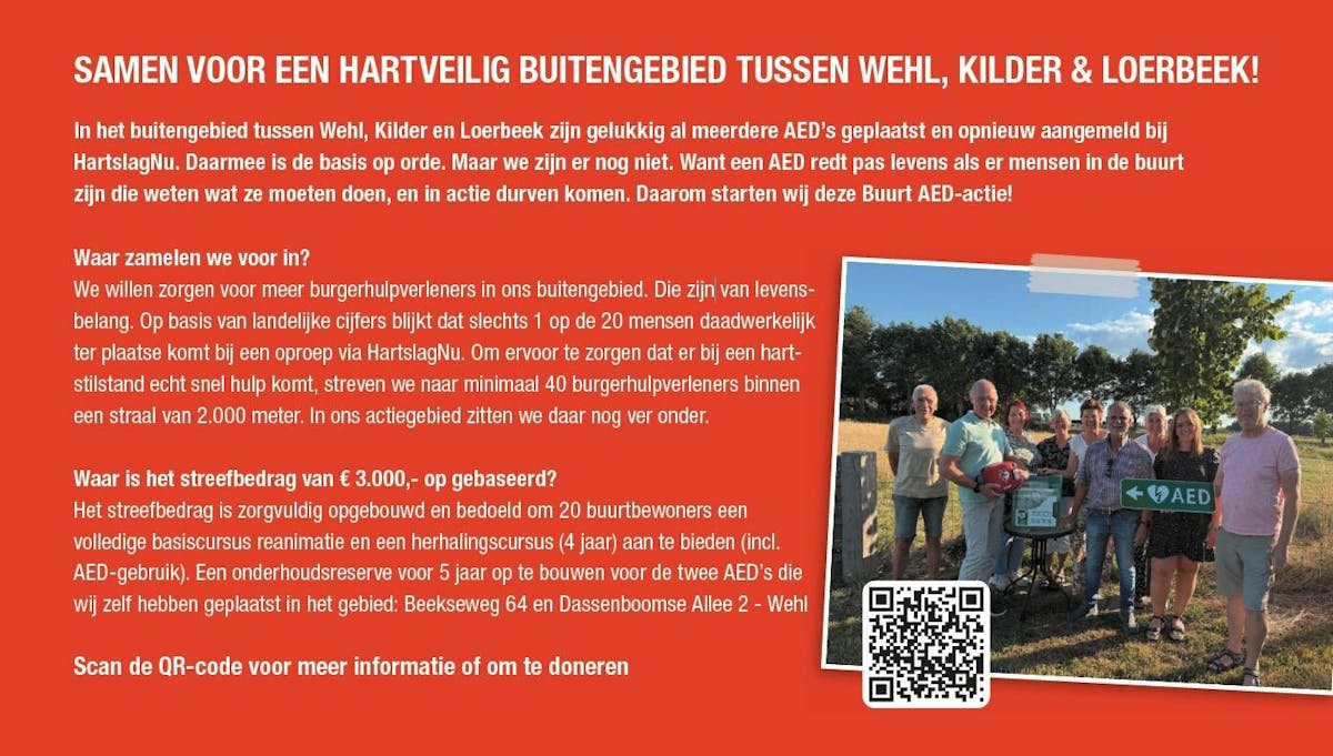Een hartstilstand kan iedereen overkomen. Elke minuut telt, en directe hulp door buurtgenoten kan het verschil maken tussen leven en dood. In het buitengebied tussen Wehl, Kilder en Loerbeek zijn gelukkig al meerdere AED’s geplaatst, maar dat alleen is niet genoeg. Er moeten ook voldoende burgerhulpverleners zijn die durven en kunnen handelen. Daarom vragen we jouw steun voor de Buurt AED-actie.