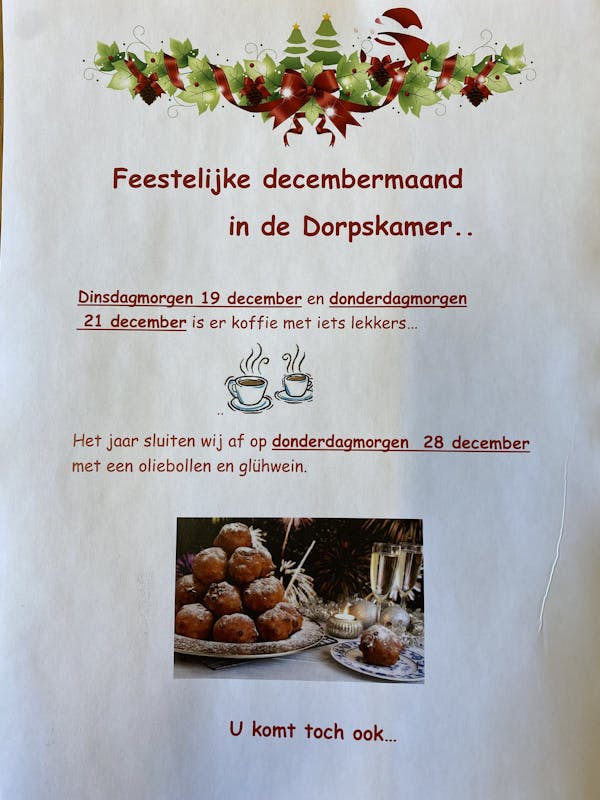 Zien we u ook op dinsdagmorgen 19 december en of donderdagmorgen 21 december in de Dorpskamer?