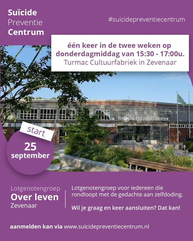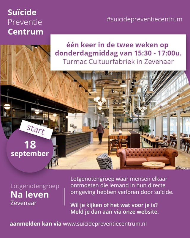 Deelname is gratis! Voor meer informatie en aanmelden kun je terecht op de website www.suicidepreventiecentrum.nl of mailen naar .